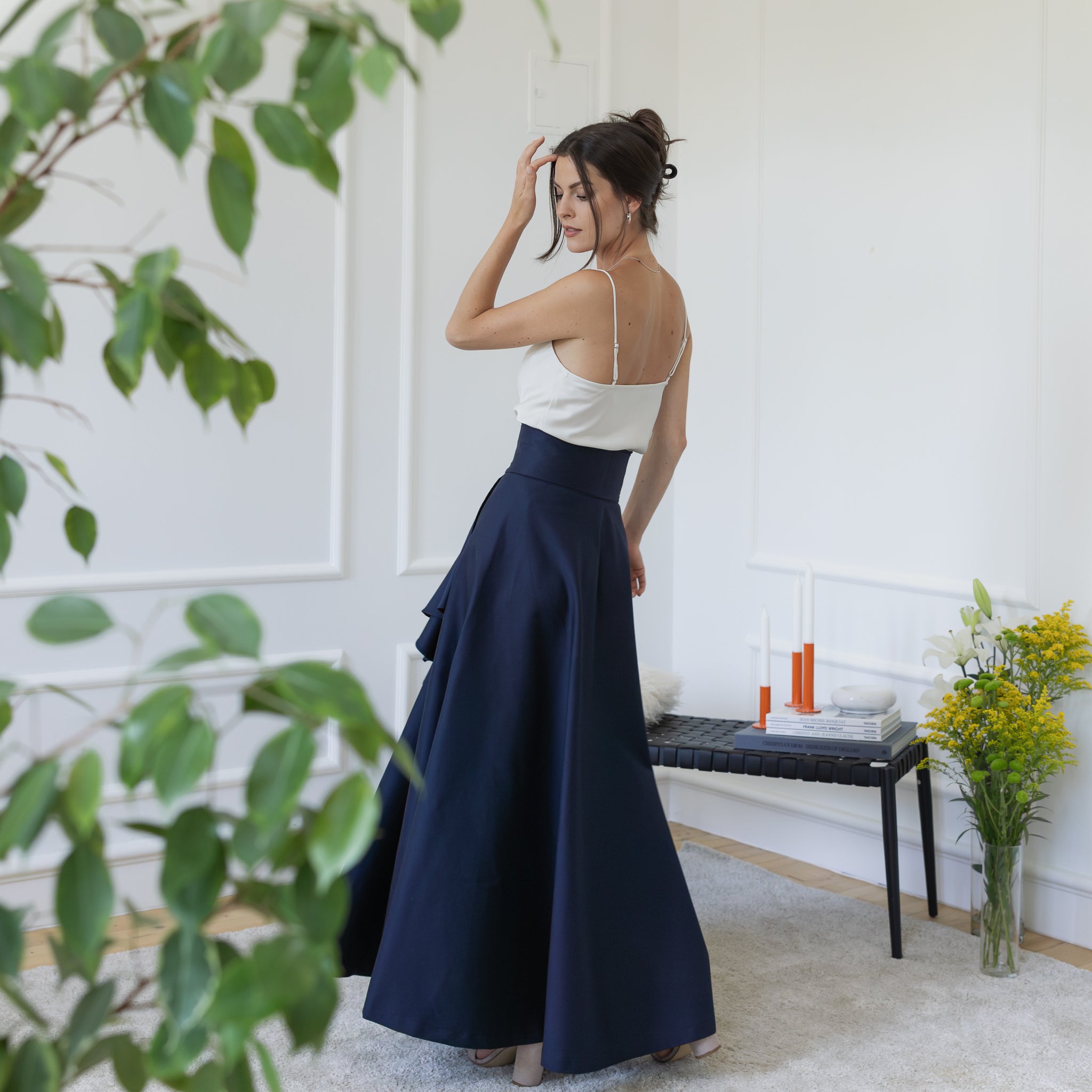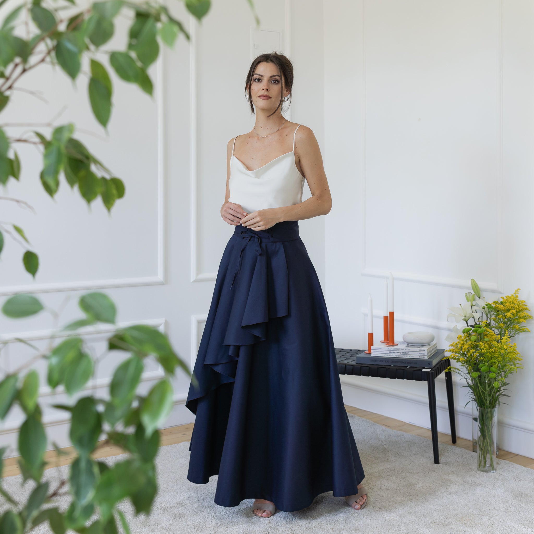 Elegantes Maxi Cotton Flared Skirt With Ruffles, Front Tie Belt and High Waist